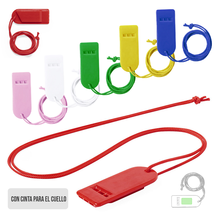 Silbato de original diseño y fabricado en resistente PS. Con cinta para el cuello a juego y disponible en extensa gama de colores.