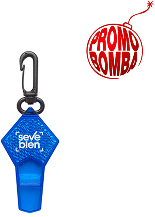 7,5 x 4 cm. Material reflectante. Silbato transparente con formato romboide. Mosquetón color negro.