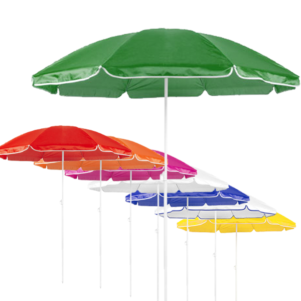 Sombrilla de playa de 8 paneles de resistente nylon en variada gama de vivos colores. De 150cm de diámetro, con faldones laterales ribeteados, tubos metalizados en color blanco y ajustable en altura. Presentada en funda de PVC con cinta de transporte para hombro. Funda PVC