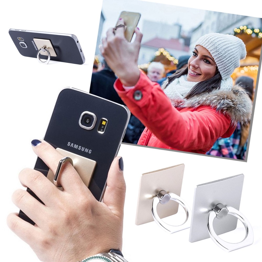 Soporte adhesivo para smartphone de diseño minimalista y elegante acabado en plateado y dorado. Con anilla posterior telescópica para dedo con función doble de soporte y accesorio para selfies. Adhesivo