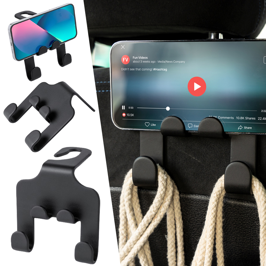 Resistente soporte fabricado en ABS. Fácil instalación mediante el gancho abierto diseñado para colocarse en el reposacabezas, con soporte para dispositivos móviles y dos ganchos adicionales para bolsas. Presentado en bolsa individual.