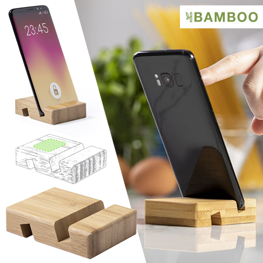 Soporte de línea nature para dispositivos móviles (smartphones y tablets). Fabricado en resistente bambú de acabado lacado, con ranura/soporte en ambas caras.