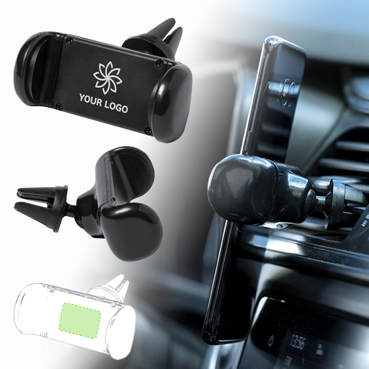 Soporte ajustable para smartphone de diseño minimalista, con base rotatoria 360º y de elegante acabado en color negro. Con sistema de fijación para rejilla de ventilación del automóvil y amplia superficie de marcaje, diseñado especialmente para tampografía. Ajustable