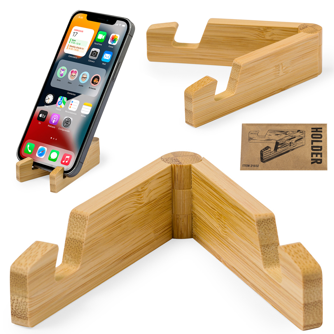 Soporte plegable para dispositivo móvil fabricado en resistente bambú. Con patas ajustables y presentado individualmente en bolsa de papel reciclado. Materiales como el bambú fomentan la utilización de materias primas naturales, reduciendo las emisiones contaminantes. Proviene de una planta de gran resistencia y versatilidad, con crecimiento y regeneración rápidos, siendo una excelente alternativa al uso de madera tradicional.
