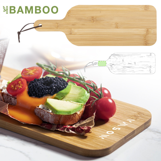 Tabla fabricada en bambú, de suave y resistente acabado pulido. Ideal para corte y presentación. Con asa para fácil manejo y cordón para colgar en símil piel.