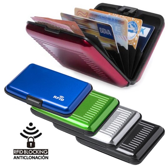 Tarjetero con tecnología de seguridad RFID (Identificación por Radio Frecuencia) que mantiene seguros tus dispositivos de transmisión de identidad. De resistente diseño en aluminio, con 6 compartimentos distribuidos en acordeón y zona lisa en el exterior diseñada para marcaje en láser. Protector RFID. 6 Compartimentos