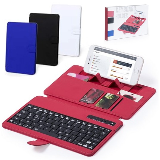 Teclado soporte Bluetooth® con función soporte para dispositivo móvil en suave acabado de polipiel. De diseño compacto, con solapa de cierre magnético, tarjeteros interiores, en atrevidos colores y recargable mediante cable mini USB -incluido-. Compatible con cualquier sistema operativo y presentado en atractiva caja de diseño. Conexión Bluetooth. Batería 1000 mAh
