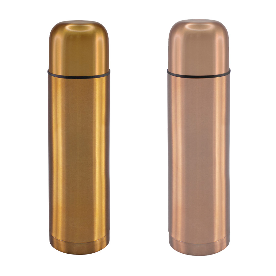 Termo metálico encobrizado de 1/2 litro, tapa con dosificador. Presentación en estuche de cartón laminado negro.