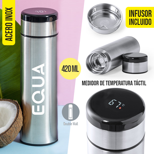 Termo en acero inox de 420ml de capacidad con medidor de temperatura táctil integrado en tapón (pila botón incluida). Con doble pared para mejor y más duradera conservación de la temperatura. Infusor incluido y sistema de apertura fácil a rosca. Disponible en color plateado y presentado en atractiva caja de diseño. 420 ml. Medidor Temperatura Táctil. Infusor Incluido. Pila Botón Incluida