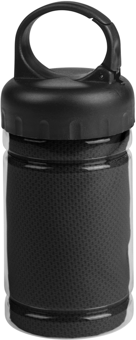 Medidas toalla 79 x 29 cm / Medidas frasco: Ø6,5 x 17 cm. Políester. Toalla de enfriamiento en un estuche de plástico transparente. Para un efecto refrescante humedezca la toalla con agua o agregue agua en el cilindro e incorpore la toalla. Tapa a rosca con mosquetón.