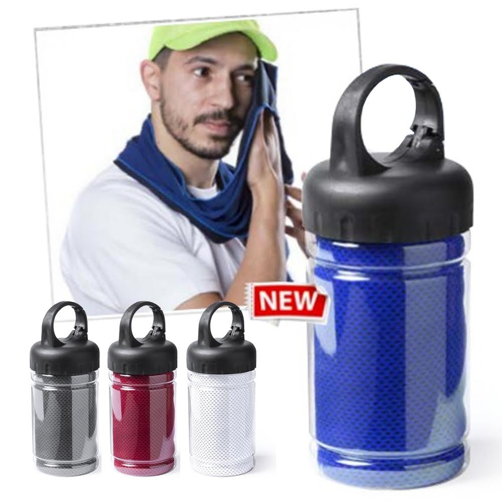 Toalla de 90x30cm en material refrigerante SoftCool Extreme con protección UV50. De 160g/m2 y presentada en estuche individual transparente con asa mosquetón de transporte integrada en tapa. *Para pedidos con impresión, se debe incrementar el coste del marcaje + 0,20 / unidad en concepto manipulación especial* Protección UV50