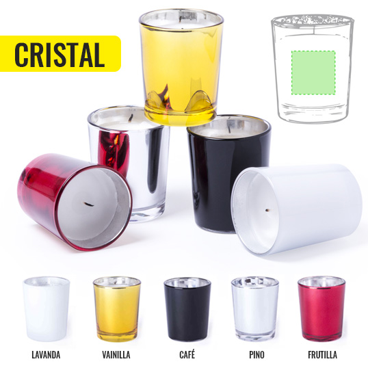 Original vela aromática en recipiente de cristal de vivos colores y variadas fragancias. Disponible en aromas café, pino, lavanda, vainilla y fresa. Presentada en caja individual.